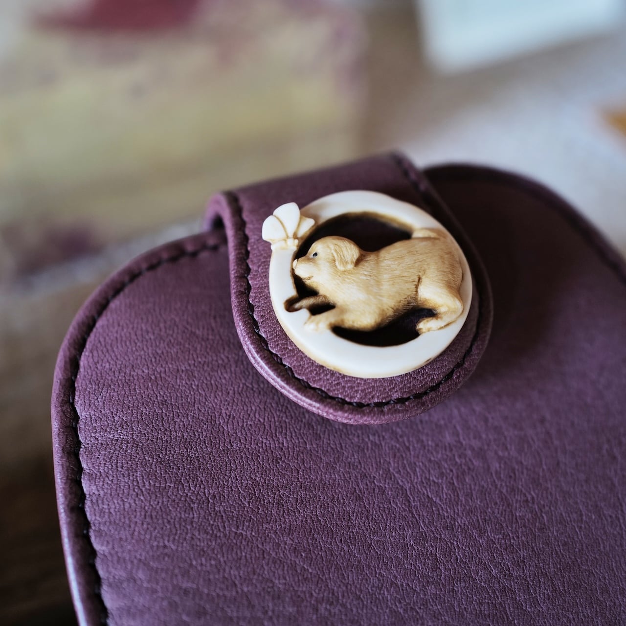 鹿の角のモチーフは、蝶と戯れる子犬。やさしく、あたたかいピンクの色合いと、平和の象徴のような子犬たちの飾りは、見るだけで心を安らかに、穏やかにしてくれます。すこし荒んだこころの時も、このお財布を眺めれば、不思議と落ち着いてきます。