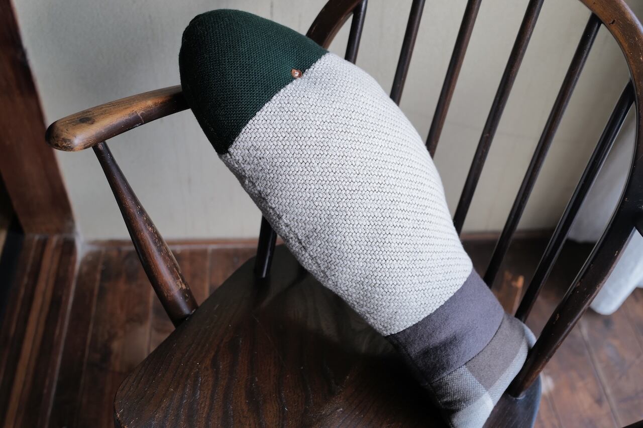 様々な椅子生地のはぎれをつなぎ合わせて作ったさかなクッション。目の部分はヌメ革を丸くカットしたものを白い糸で留めてポイントにされています。ひとつひとつ、製作順にナンバーが縫い付けてあり、ひとつとして同じ番号はありません。