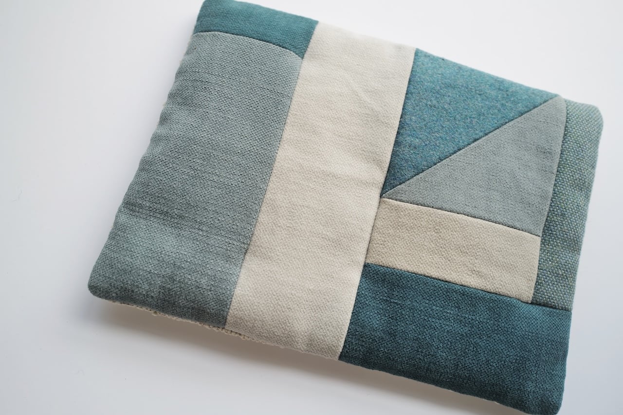 椅子の張り替えで出たハギレを使った、つなぎ布の小座布団。ひとつとして同じ色柄がありません。