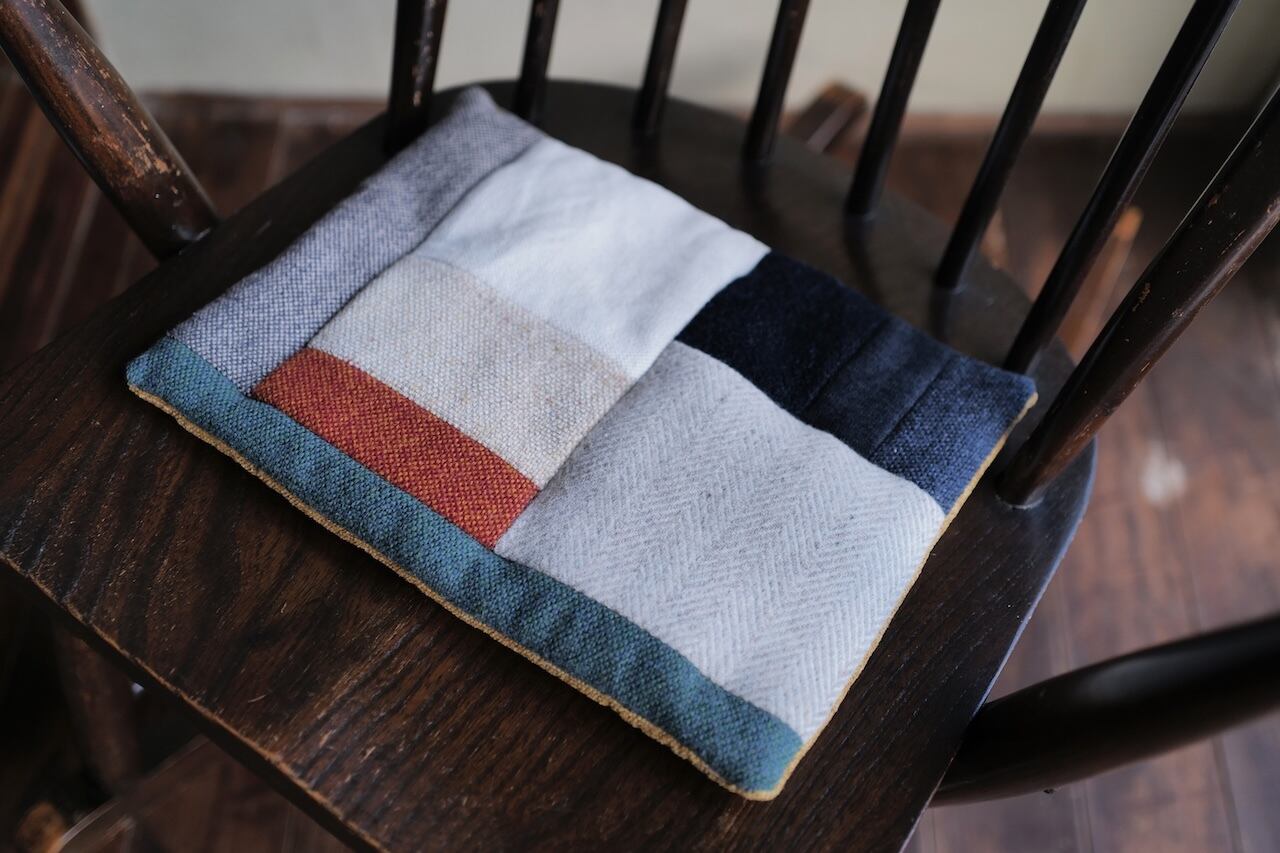 椅子の張り替えで出たハギレを使った、つなぎ布の小座布団。ひとつとして同じ色柄がありません。