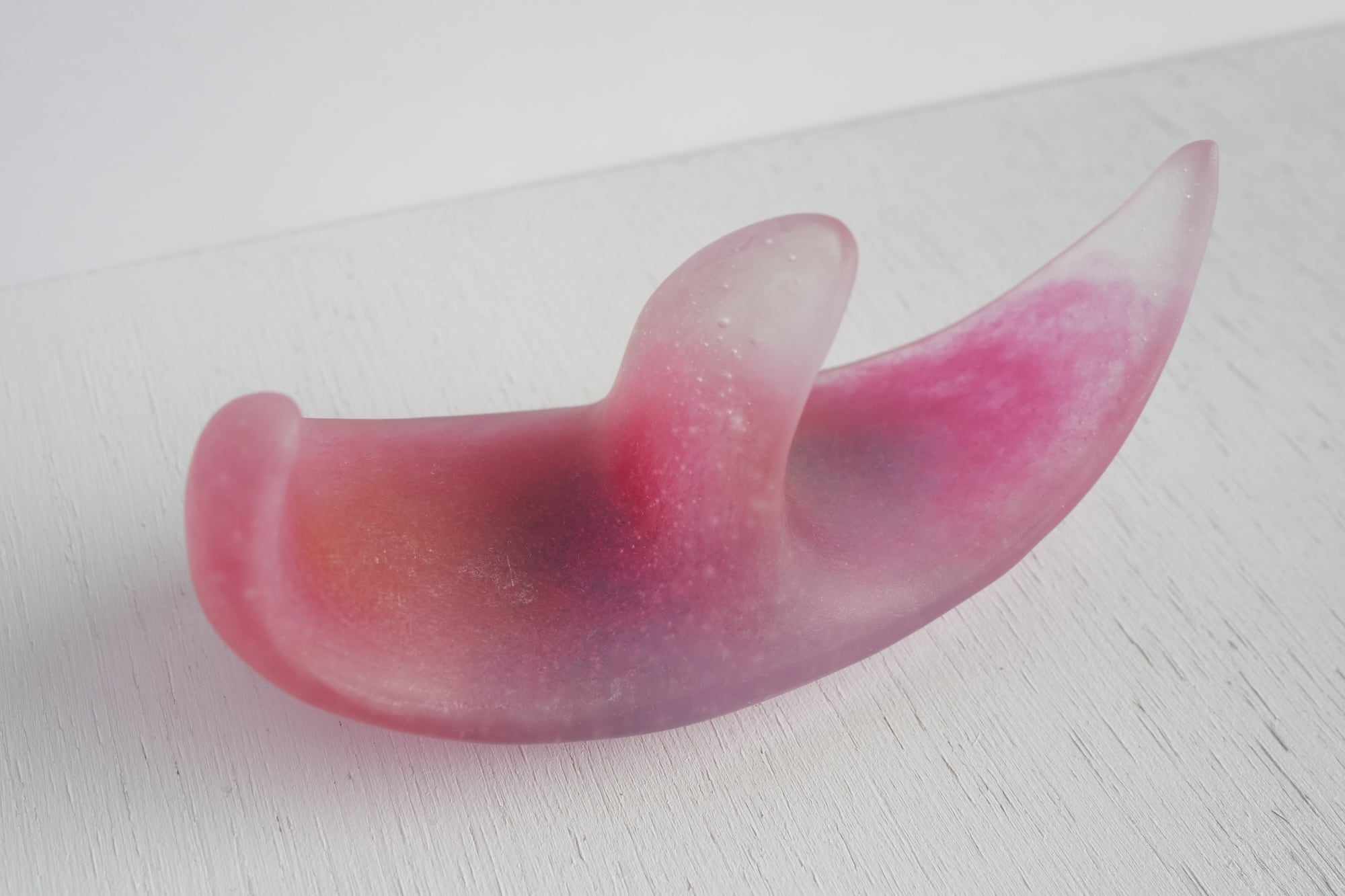 ガラスの粉やカレットを詰めた石膏型を電気窯で850度で焼成し、ガラスを溶かして石膏型に鋳造する技法です。パート・ド・ヴェールとも呼ばれます。