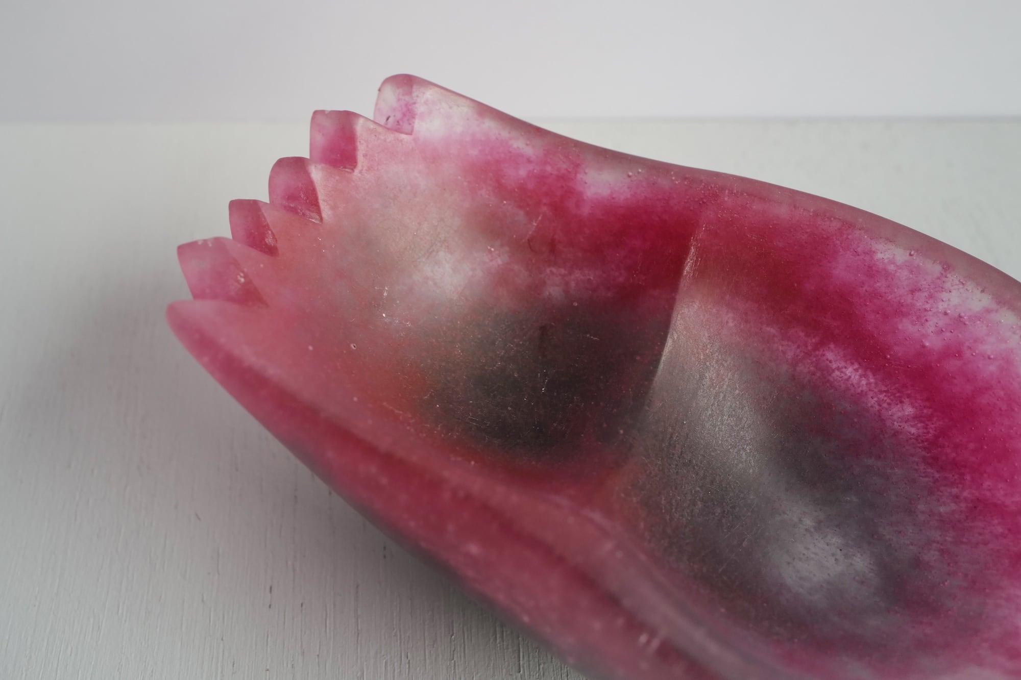 ガラスの粉やカレットを詰めた石膏型を電気窯で850度で焼成し、ガラスを溶かして石膏型に鋳造する技法です。パート・ド・ヴェールとも呼ばれます。