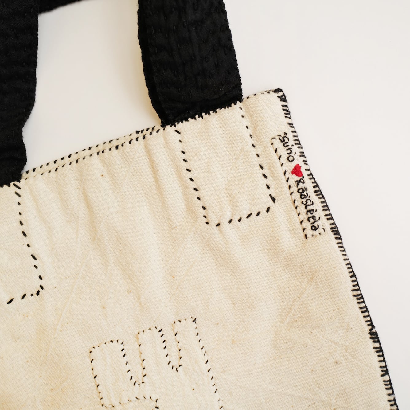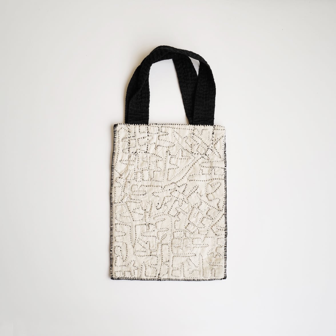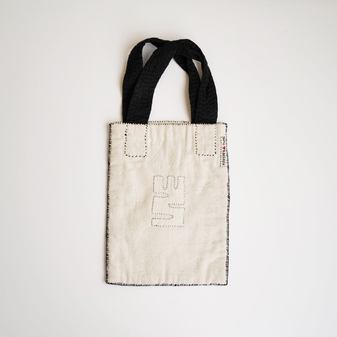 インドの伝統的な手紬ぎ・手織りのカディコットンを使って作られた小ぶりなハンドバッグです。生地にはインドの女性職人によるハンドステッチが施されており、1点1点がまるで布のアート作品のようなデザインになっています。