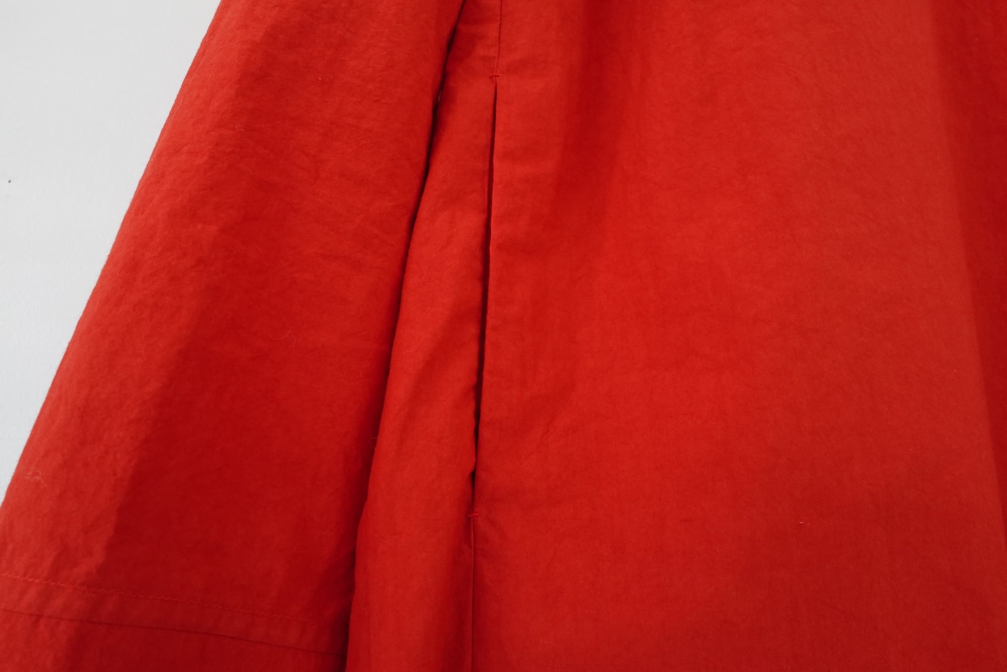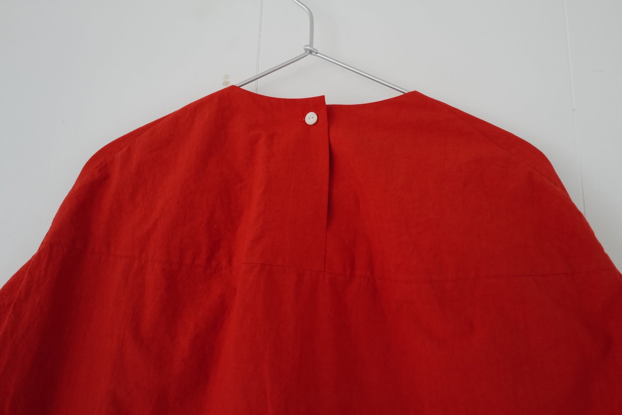 定番の丸首シャツのコットンタイプライター硫化染めの朱色。